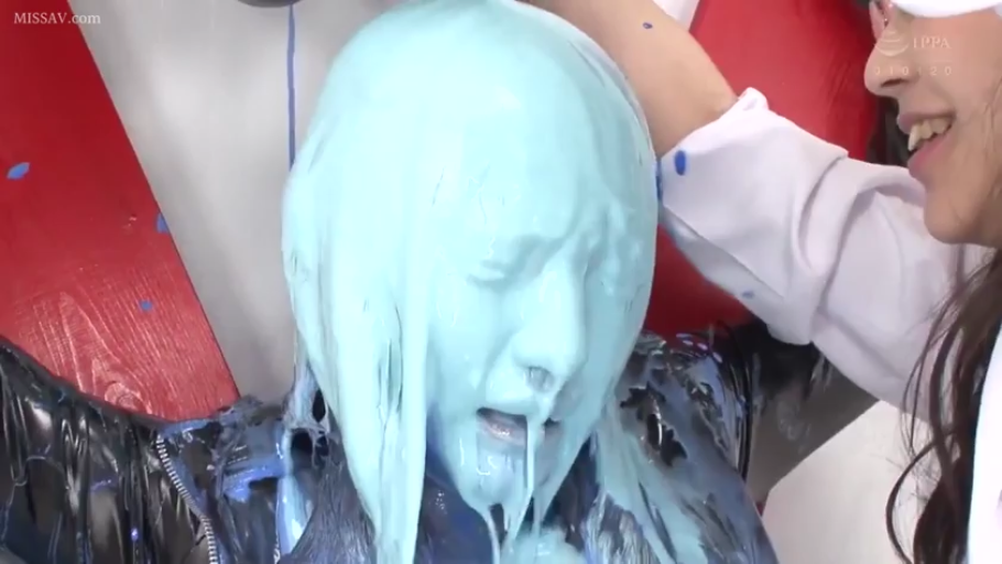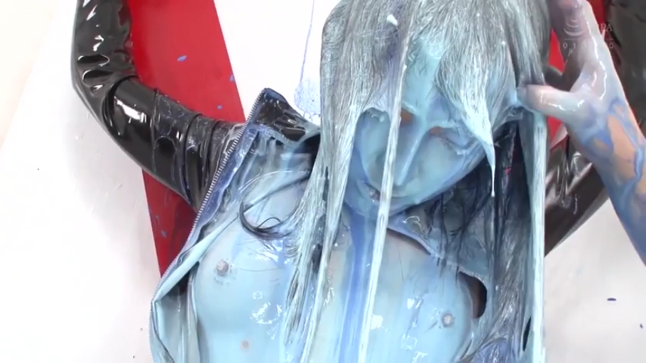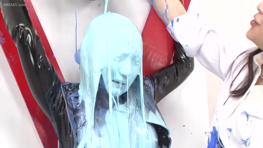 室内 · 脸部特写 · 呆滞 · 正面坐姿 · 黑色外套 · 颜料 · 粘稠 · 淋油漆