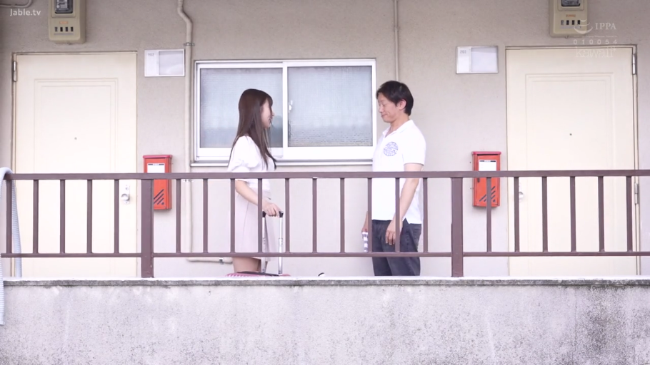 交谈 · 站立 · 行李箱 · 微笑 · 白色上衣 · 远景 · 公寓走廊 · 邻居