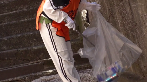 蹲姿 · 平静 · 远景 · 街道 · 卫衣 · 黑长直 · 捡垃圾 · 垃圾夹